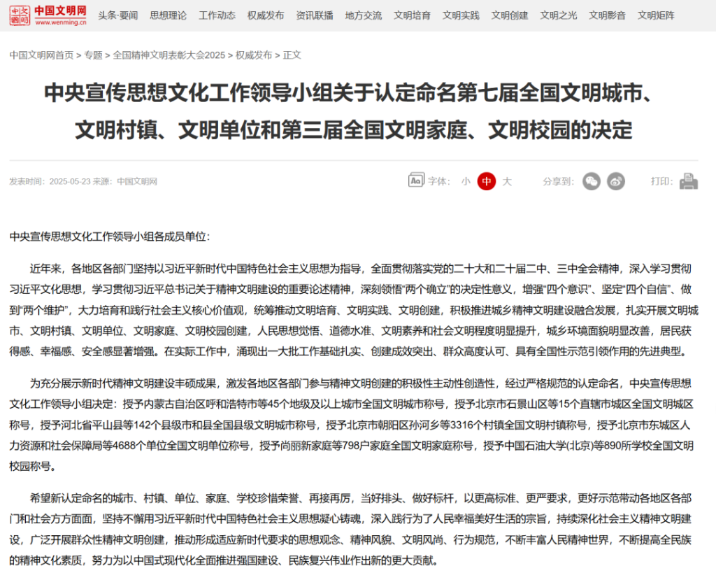 5月23日,中央文明委公布了《中央宣传思想文化工作领导小组关于认定命名第七届全国文明城市、文明村镇、文明单位和第三届全国文明家庭、文明校园的决定》。荣获第七届“全国文明单位”称号。